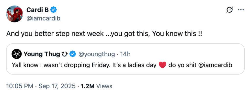 Thugger tweeted on Wednesday (Sept. 17), “Yall know I wasn’t dropping Friday. It’s a ladies day. Do yo s**t @iamcardib.” To which the femcee replied, “And you better step next week …you got this, You know this !!”