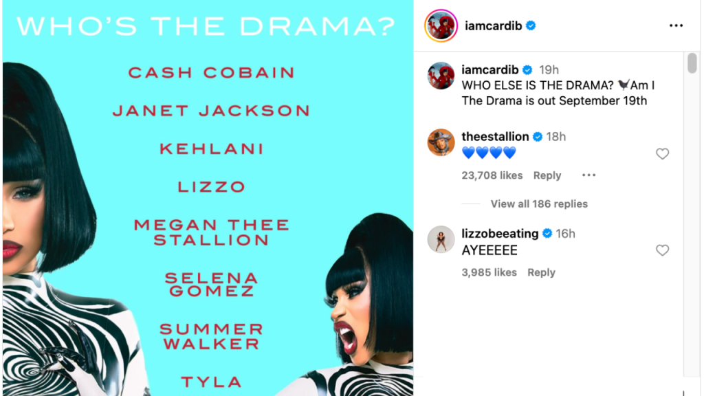 Cardi B has revealed the group of artists set to be featured on her anticipated sophomore album, Am I The Drama? The Bronx-bred rhymer took to social media to list “who else is the drama?” and name-dropped fellow rappers as well as singers in a colorful graphic. The album is set to release on Friday (Sept. 19).