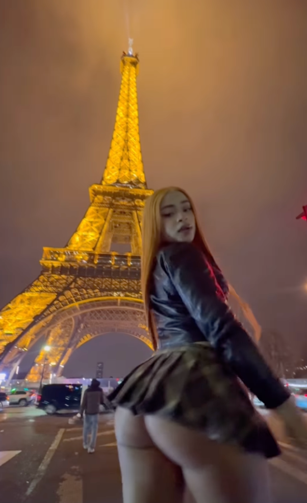 The Bronx-bred rapper shared a teaser for upcoming song “Thick Again” while twerking in Paris at the Eiffel Tower. In the preview, the 25-year-old sports a long, bone straight ginger wig, a plaid micromini skirt that flaunts the bottom half of her butt, a leather jacket bearing full cleavage, and her signature munchkin chain.