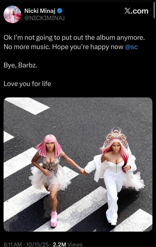 Nicki Minaj dropped a bombshell via X on Wednesday (Oct. 15), announcing that she’s “not going to put out” her upcoming 2026 album NM6.