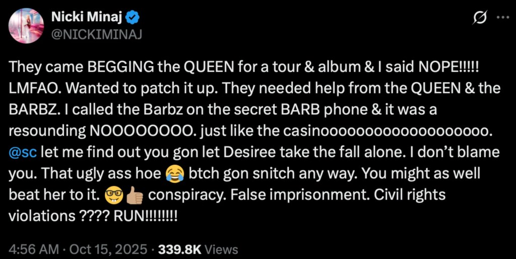 “Nicki take a break from social media and heal,” suggested one fan on X. “you’ve got a lot going on. You went from being the bully to playing the victim. Sometimes silence says more than tweets ever will.” Another fan reassured her, “We riding with you no matter what. Forget the music.. what else you selling?”