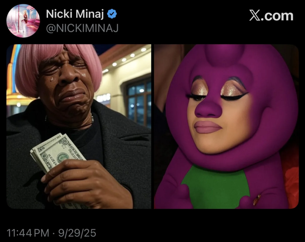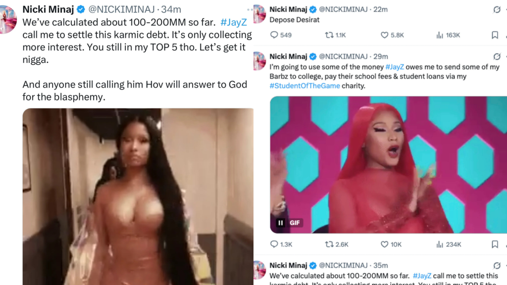 Her issues with Jay also overlapped with her recent online exchange with Cardi B, during which Minaj posted AI-generated images of JAY-Z. She posted a photo of Jay in a pink wig, as well as images of him as a camel.
