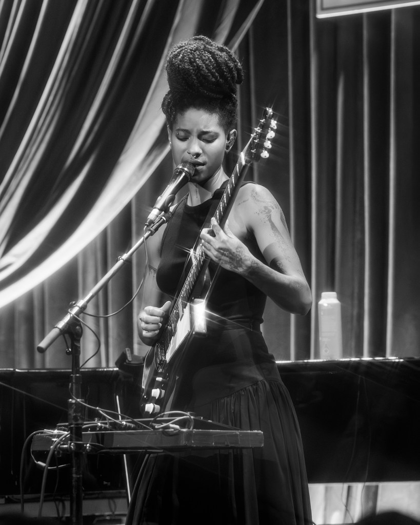 Either way, by the next year, she really grew as a performer and a songwriter. Her 2023 Coachella performance was killer as was her Tiny Desk show the following year. She expanded Empathogen with a deluxe version called Ceremonial Contrafact, which featured revered composer and saxophonist Kamasi Washington. He returns on the hypnotic “Play,” a standout on Petal Rock Black, along with a shimmering collab by Oakland’s Tune-Yards called “Omnipotent.” She refrained from playing the new album’s effects-laden cover of Prince’s “I Would Die 4 U” during the set we saw, but the artist’s influence on her overall is palpable.