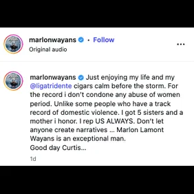 Hitting the golf course, Marlon accepted Fif’s invitation for the smoke, and shared a video of himself smoking a cigar, looking unbothered. However, his caption further echoed some of Ja Rule’s statement. He denounced violence against women while seemingly mentioning 50 Cent’s alleged history of domestic violence. “Just enjoying my life and my @ligatridente cigars calm before the storm. For the record i don’t condone any abuse of women period. Unlike some people who have a track record of domestic violence. I got 5 sisters and a mother i honor. I rep US ALWAYS. Don’t let anyone create narratives … Marlon Lamont Wayans is an exceptional man,” he wrote. “Good day Curtis…”