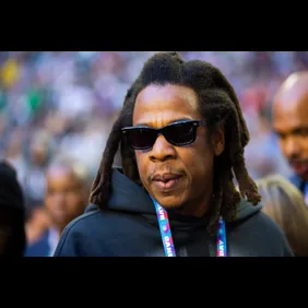Feb 12, 2023; Glendale, Arizona, US; Recording artist Jay-Z on the sideline before Super Bowl LVII at State Farm Stadium. Mandatory Credit: Mark J. Rebilas-USA TODAY Sports via Imagn Images
